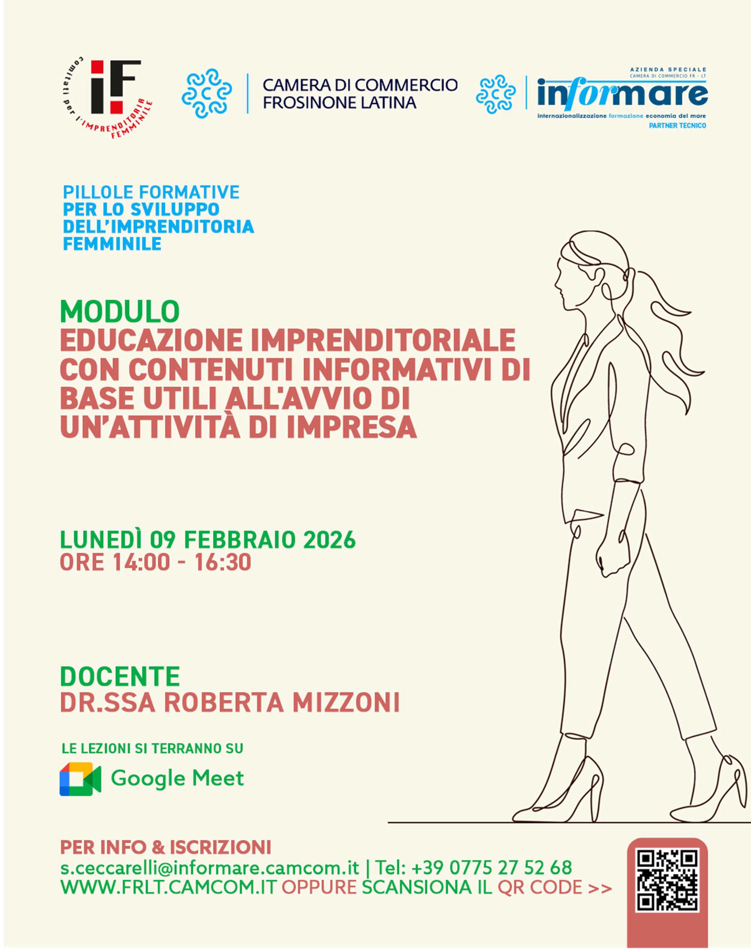 Affronteremo la tematica dell’educazione imprenditoriale con contenuti informativi di base utili all'avvio di un’attività di impresa, nel webinar promosso dal Comitato per l’Imprenditoria Femminile della Camera di Commercio di Frosinone Latina con la collaborazione di Informare, in programma lunedì 9 febbraio 2026 dalle ore 14:00 alle ore 16:30, sulla piattaforma Google Meet.